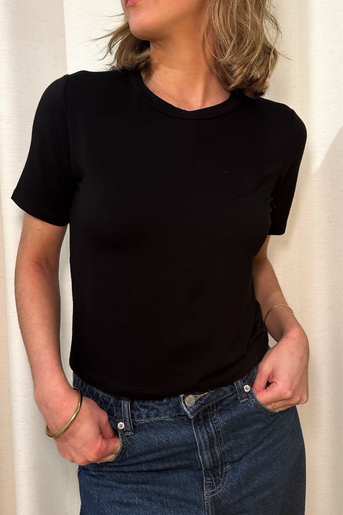 The cut: This essential T-shirt with its slim fit and perfect stretch offers optimal comfort. It hits at the navel and features a crew neck.