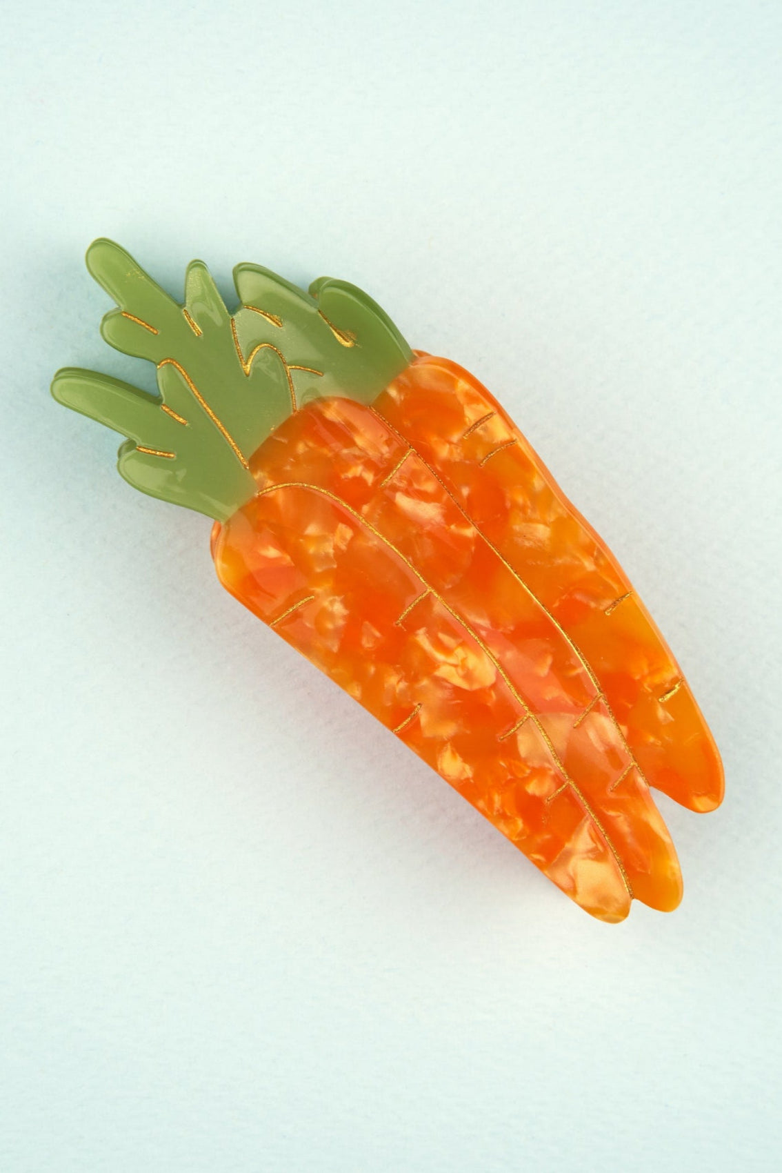 Calling all fans of crunchy vegetables (or croquang as Cyril Lignac would say), here is a beautiful hair clip in the shape of a bunch of carrots! Three pretty carrots neatly arranged, foliage in the wind, ready to tame impromptu buns. We love its graphic design and its orange color which hypnotizes us with all its reflections.