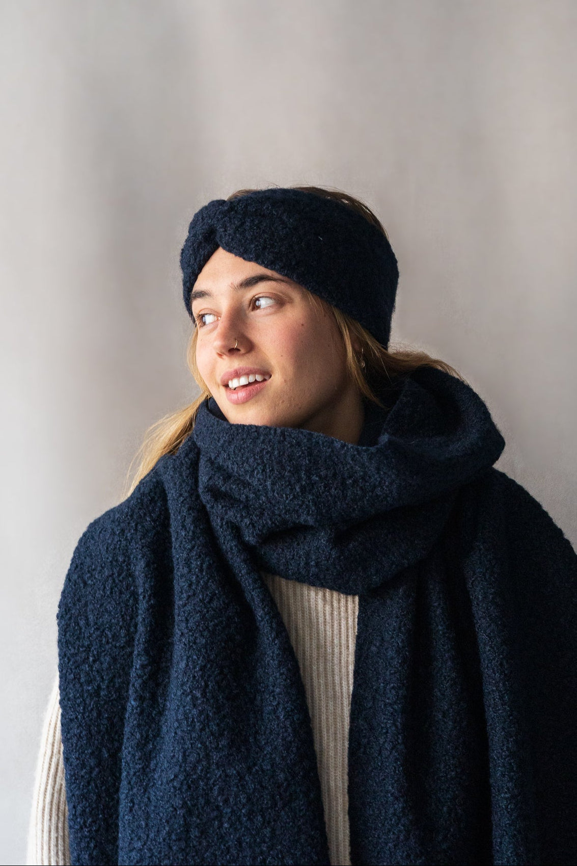 This fall-winter headband is crafted from a looped fleece material with a rich, enveloping texture. It features a pinched design at the front, held in place by a discreet seam.
