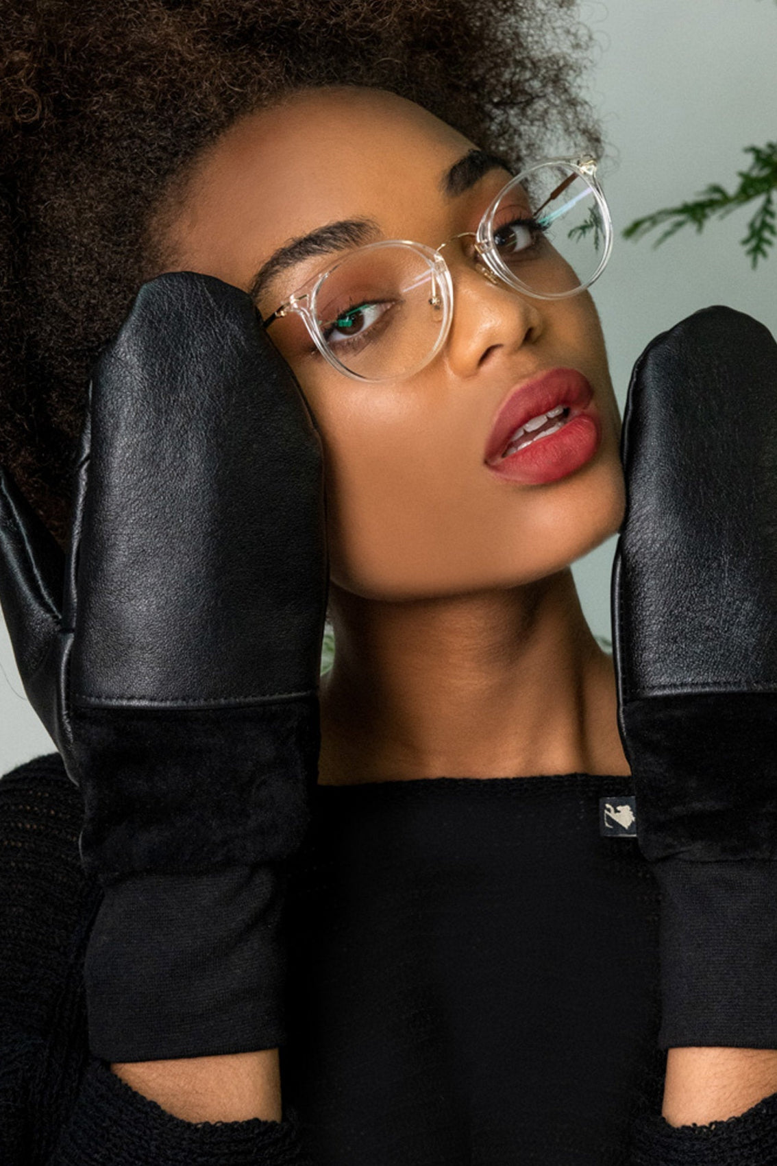 Pair of mittens made from recycled leather and suede, with ribbed cuffs.