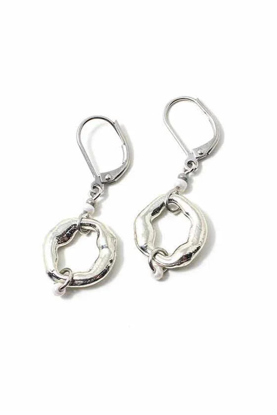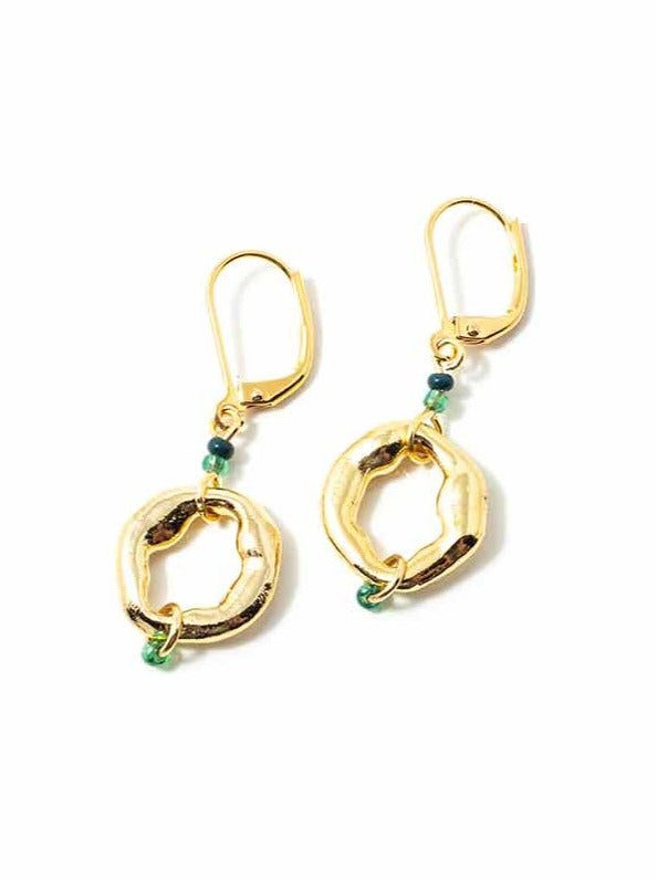 The Cija earrings are simple, delicate, and colorful dangle earrings. Brightly colored glass beads set a pewter ring with organic shapes dancing around them. They'll be the perfect touch of color and gold you need for summer.