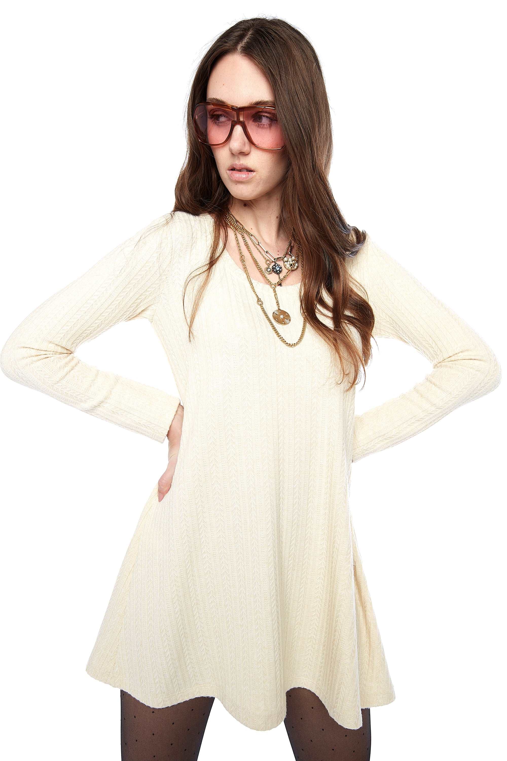 - Round neckline and fitted long sleeves.