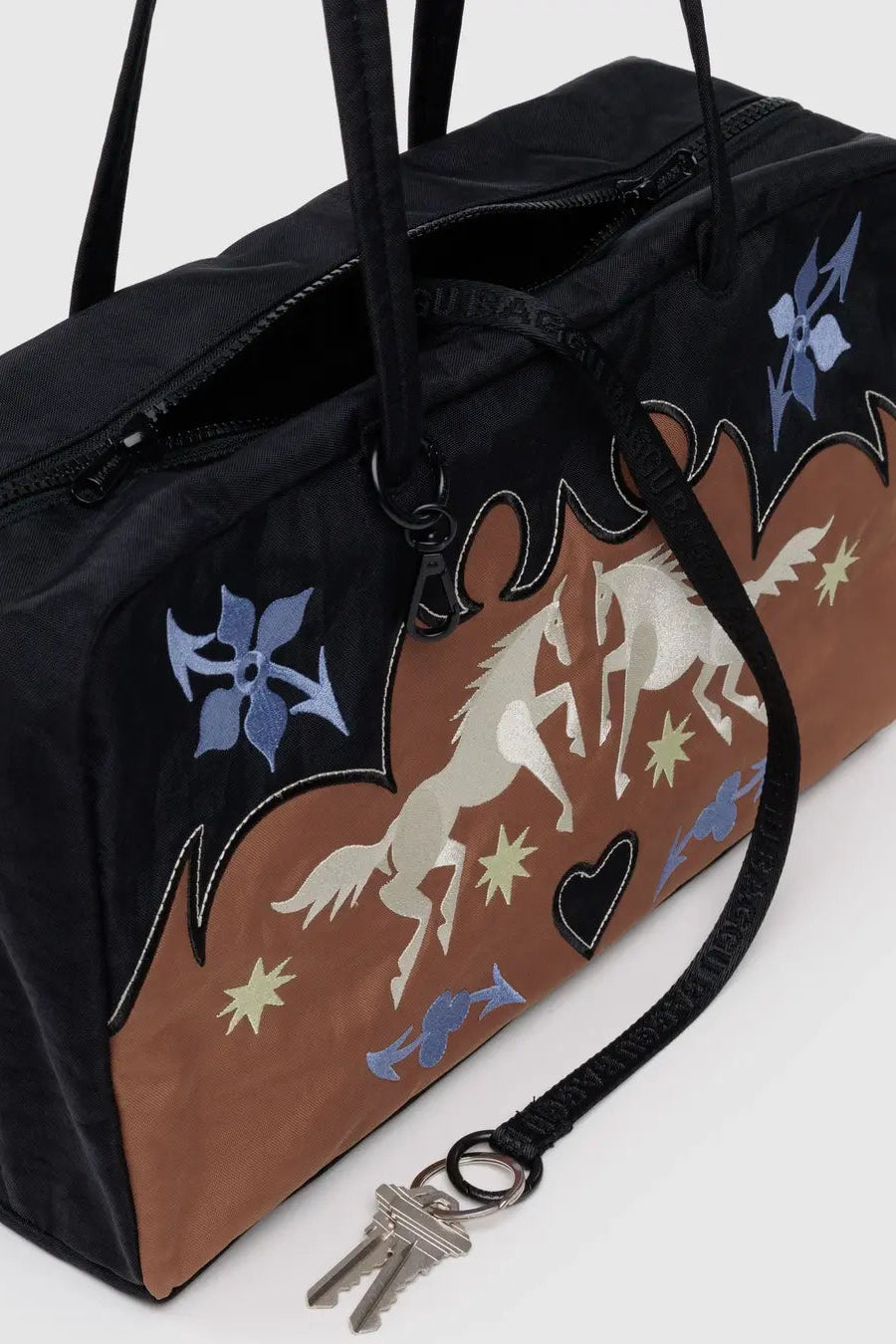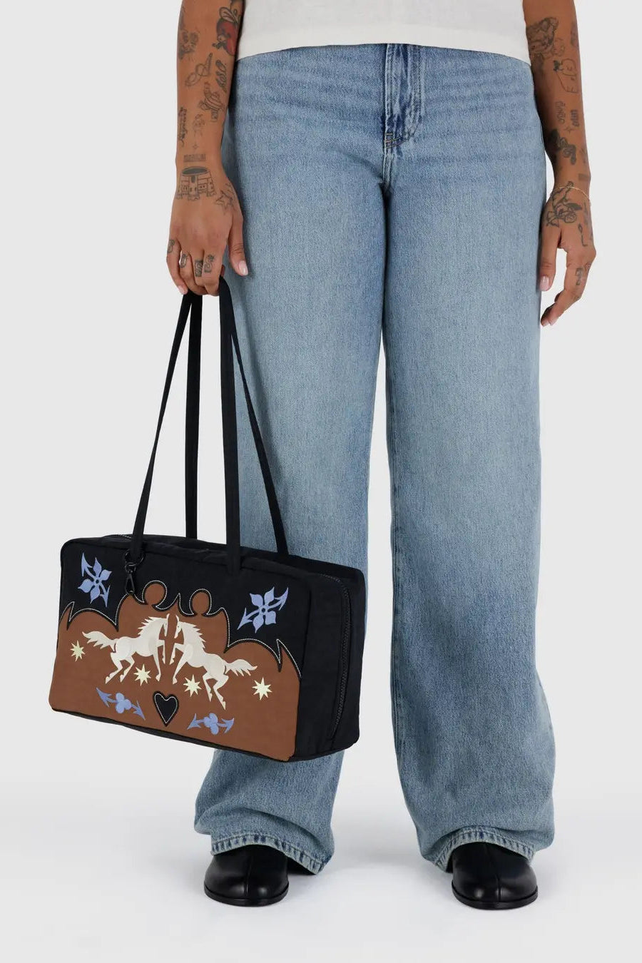 A larger version of the bowling bag, designed for personalization. Four charm rings and a swivel clasp let you accessorize it from every angle. Its spacious interior includes a handy zippered pocket and offers enough room to carry much more than just the essentials.