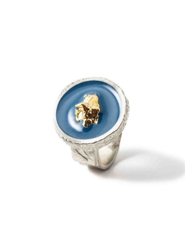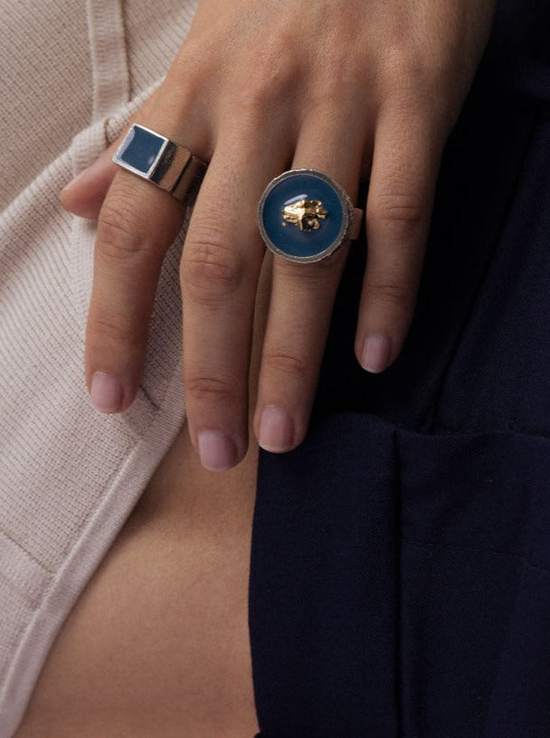 Enhance your individuality with the original design of the Wallis Resin Ring. A modern take on a pewter medallion signet ring, embellished with colored resin and a central pewter stone.