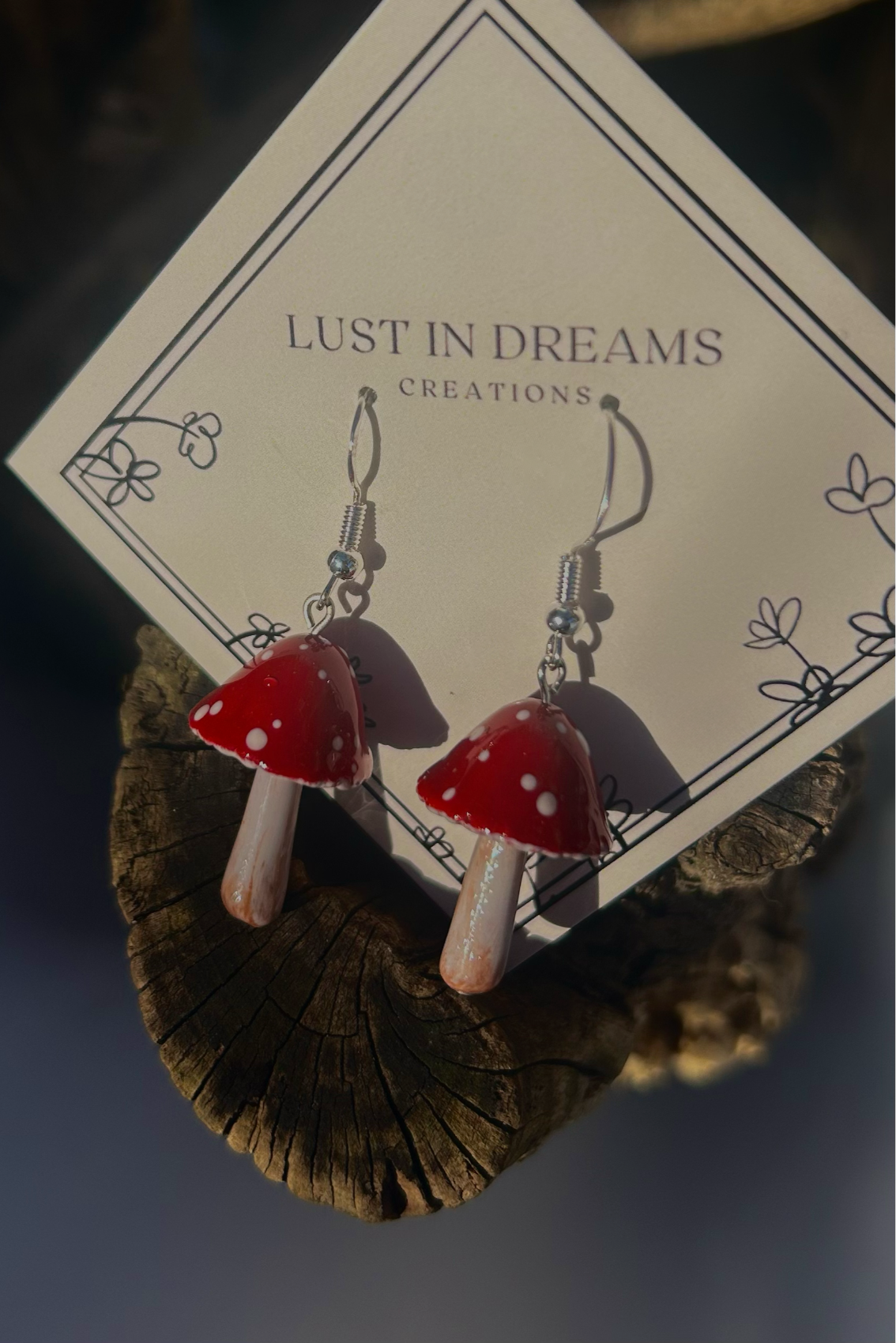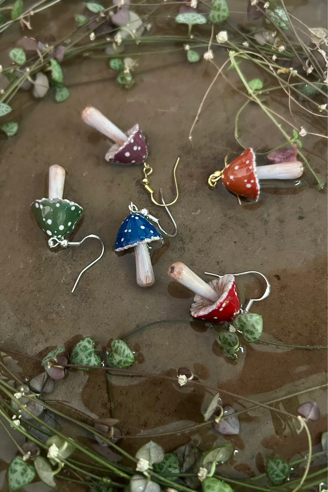 Handmade mushroom-shaped earrings made of polymer clay and epoxy resin. Each pair is handcrafted and mounted on silver or gold-plated silver hooks. Lightweight, durable, and unique, they add a unique and refined touch to your outfit.