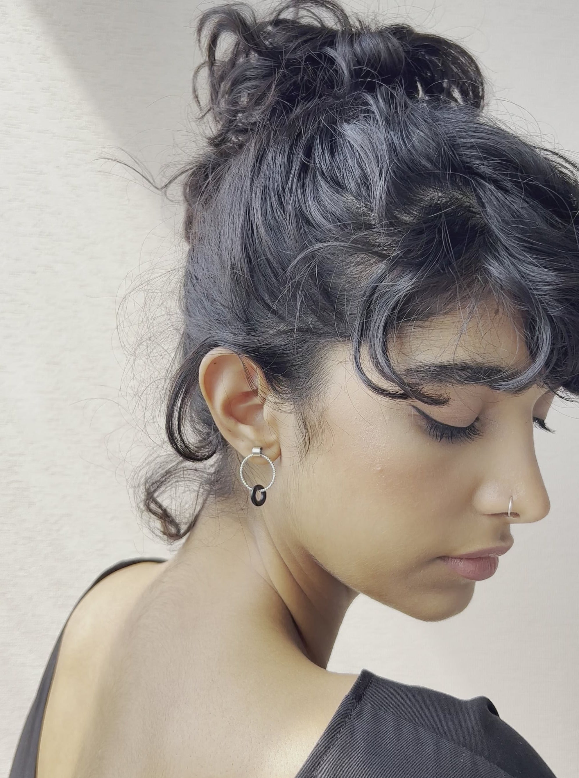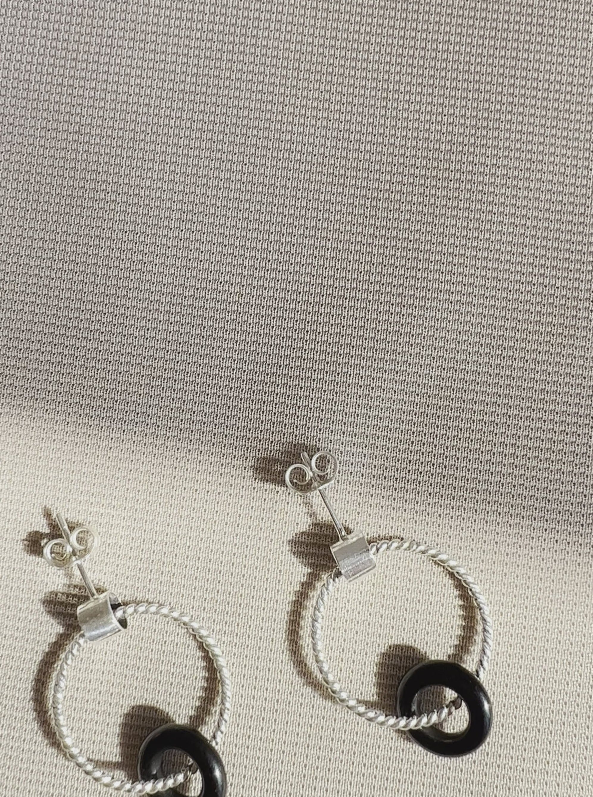 These earrings are made of sterling silver and black onyx discs. The hollows of the twist are oxidized for more contrast.