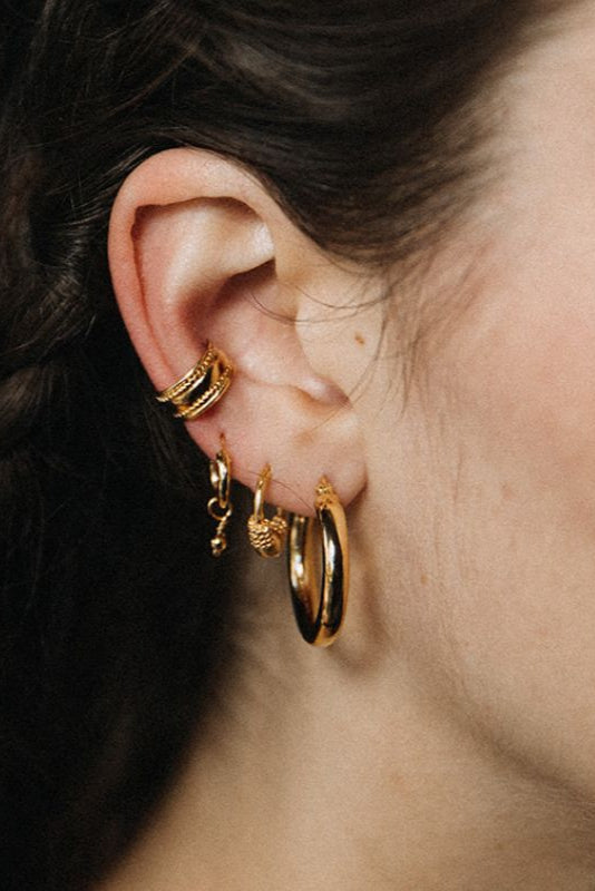 Stackable, finely crafted jewelry. Delicately adorned with a central pearl and intricate twisted wire details. Designed to be perfectly stacked with other earrings, these hoops are a versatile addition to your collection, now with a NEW CLASP.