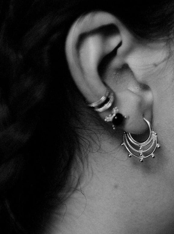 Featuring a three-row ring adorned with a classic pearl motif, these captivating earrings evoke a sense of grandeur, connection, and mystery.