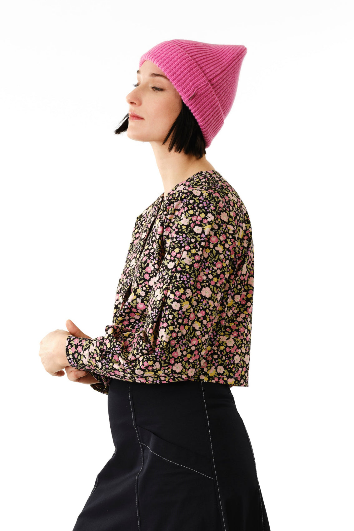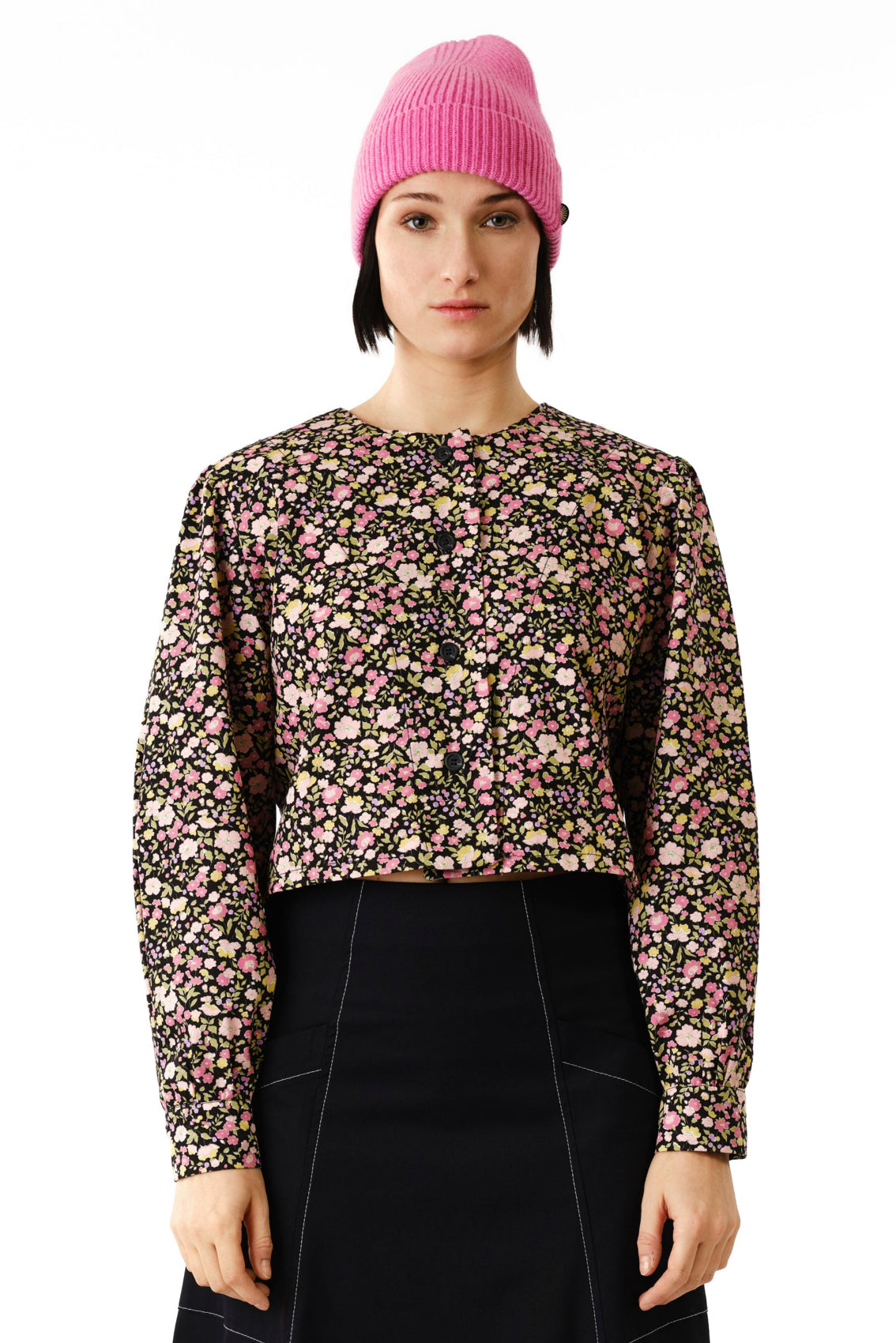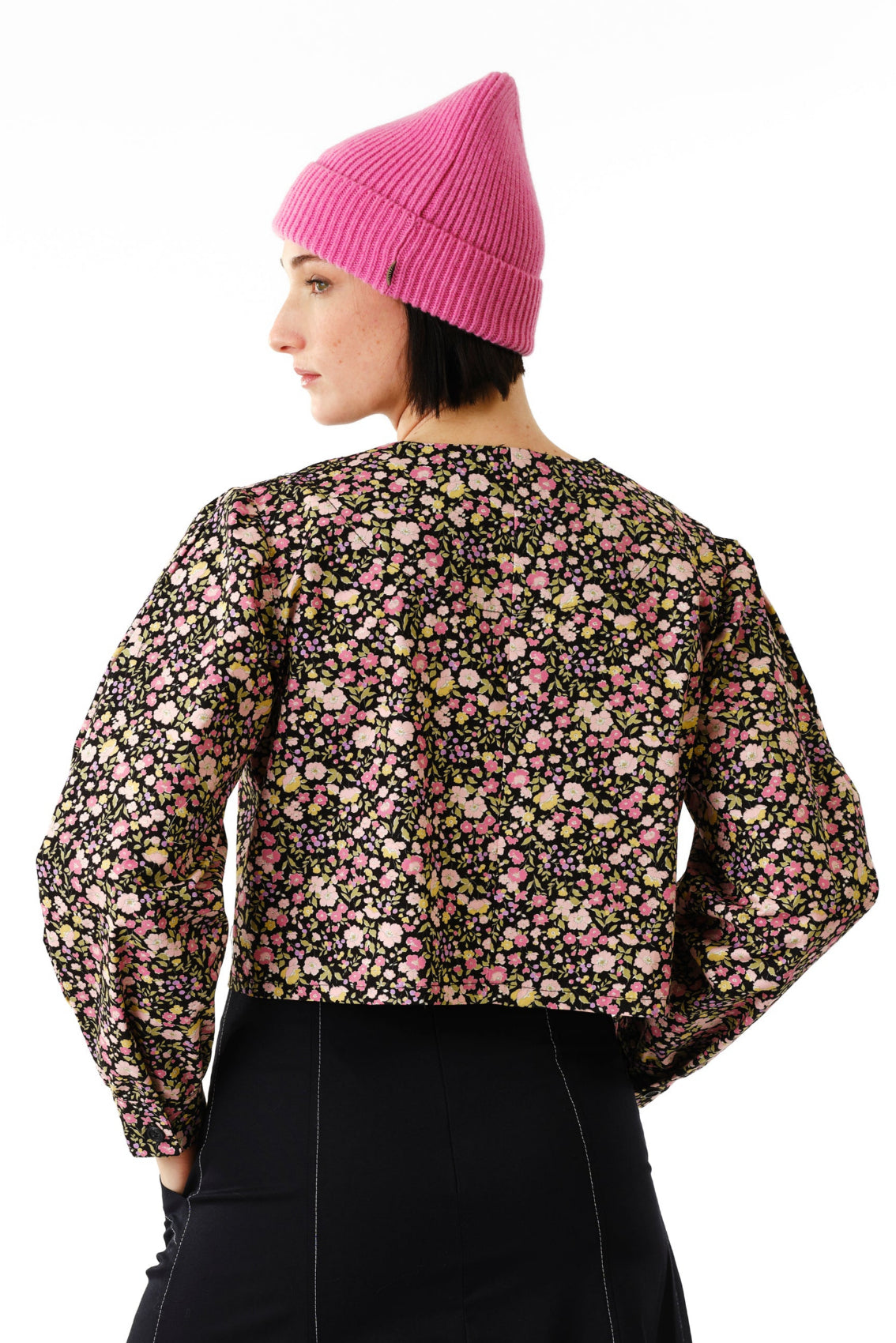 The Polaris blouse stands out with its short, loose fit, perfect for wearing on its own or as a lightweight jacket. Crafted from premium Japanese cotton, it features a delicate yet graphic floral print. Its generously pleated sleeves, defined cuffs, and rounded collar create a bold, sculptural silhouette. Lightweight yet striking, this versatile piece adds a contemporary touch to any outfit.