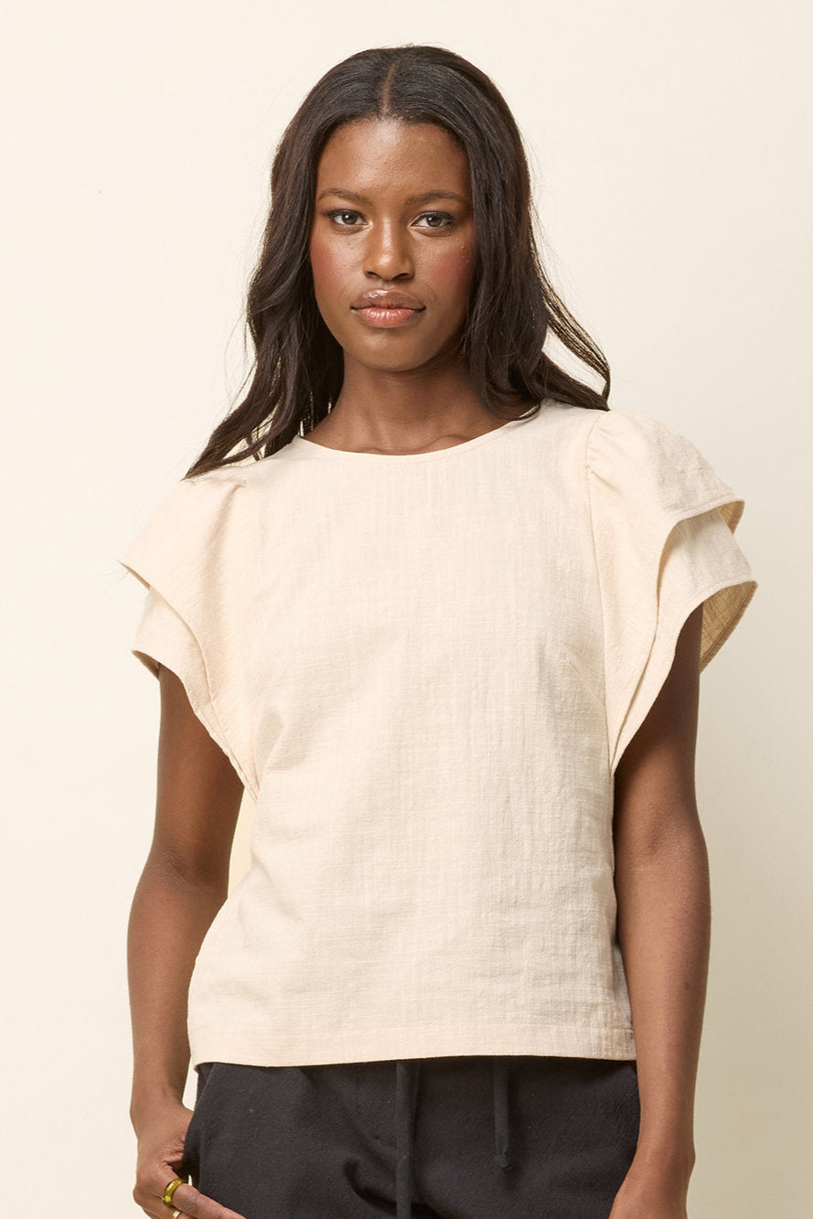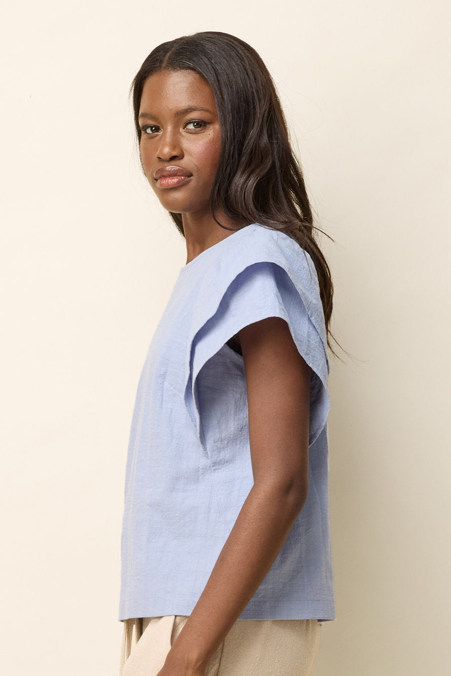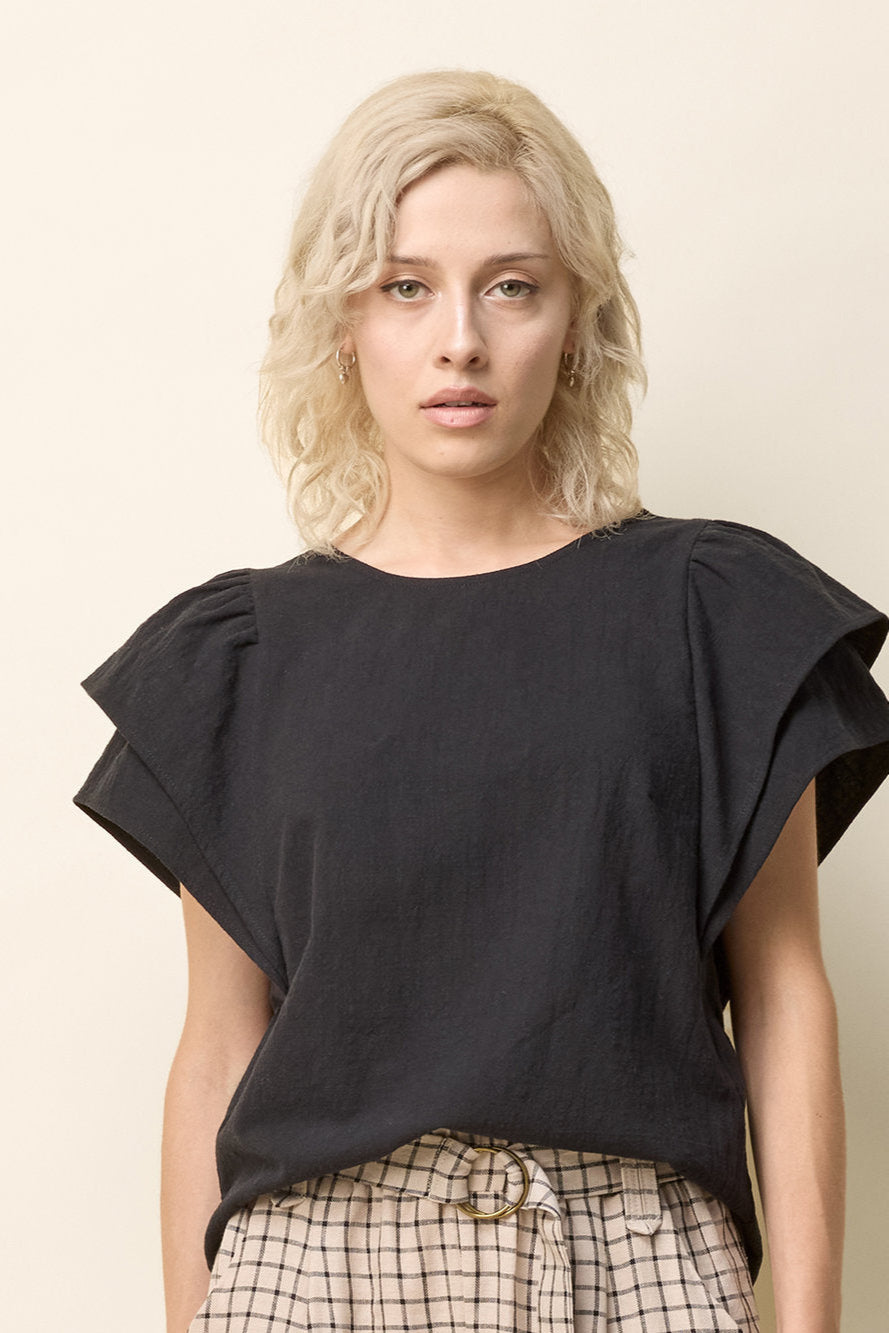 A top with a double ruffle at the sleeve to give it volume. Available in a plain version, the Olena top will be perfect to wear every day but also for a special event with its elegant sleeve detail.