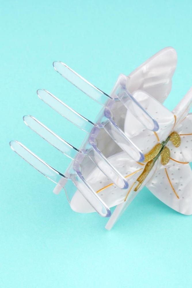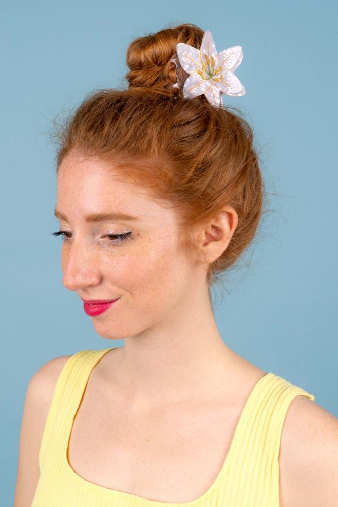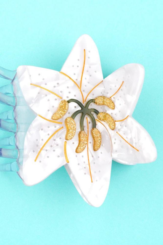 A beautiful white lily as an XL hair clip! We love this flower full of symbolism, noble and delicate with its pretty pearly petals and its pistils all in glitter. A hair accessory particularly suitable for thick fleeces that enhances all hairstyles in no time!