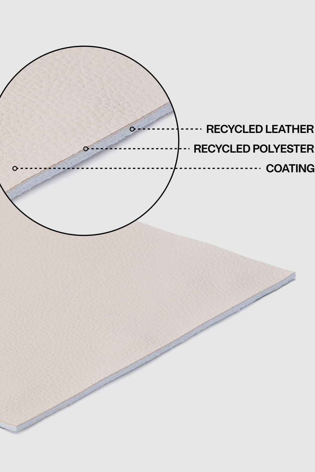 • Recycled leather composed of 70% pre-consumer recycled leather fibers, 17% post-consumer recycled polyester and 13% polyester