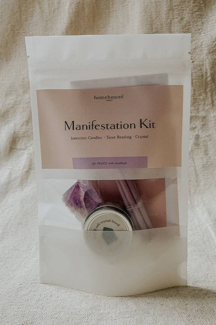 Make your space a peaceful place with the Homebound Tarot Manifestation Kit - Peace. Find a calming presence around you with an amethyst crystal, intention candles to create a moment of calm, and a tarot reading to guide you to serenity. Included in every manifestation kit.