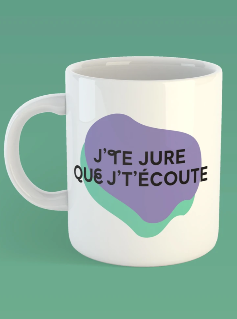 The mug is designed so that the design appears outwards when held by a right-handed person.