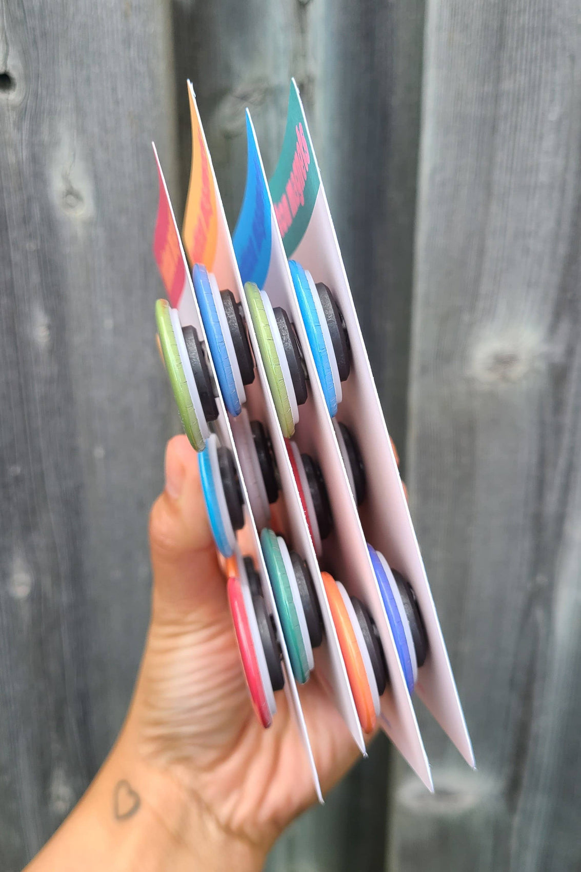 - Handmade using a button maker + extra strong glue to attach the magnets to the back of the buttons