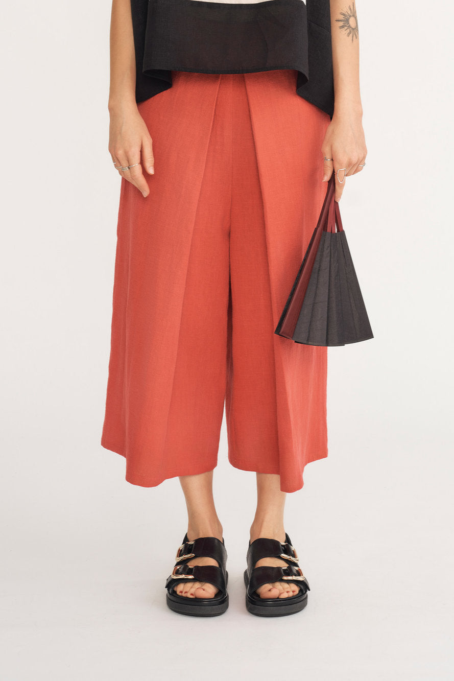 Made from 100% ramie, the Anka flared trousers are the best of both worlds. The practicality of trousers while being as elegant as a skirt. The deep pleats on the front give it an origami look and it falls to mid-calf. It has an invisible zip at the back, elasticated waist panels and pockets!