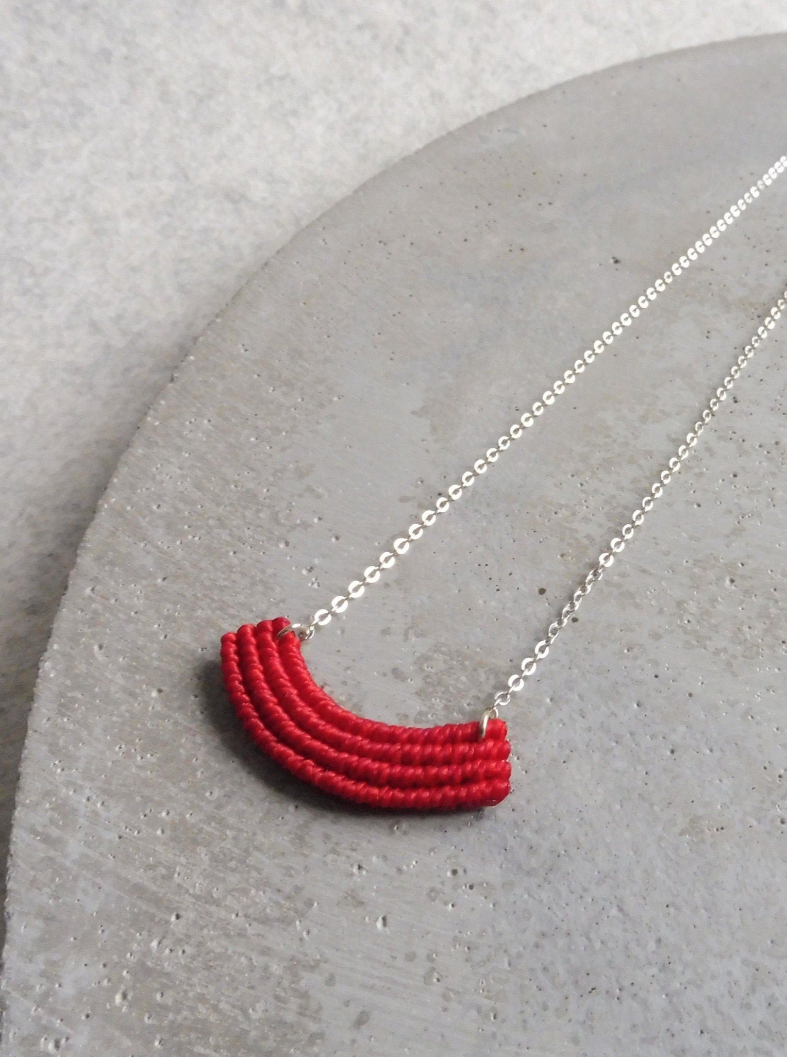 An elegant and simple necklace with a minimalist textile detail, crafted one tiny knot at a time using the micro-macrame technique. It easily complements a variety of styles, from chic to relaxed!