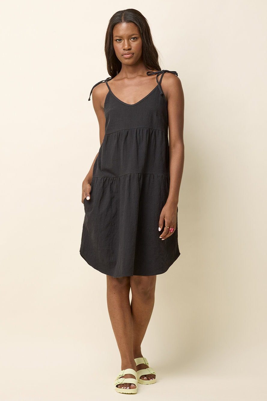 Dress with spaghetti straps tied for better support at the shoulders. We love the gathers that add pretty details. Little extra: it has pockets!