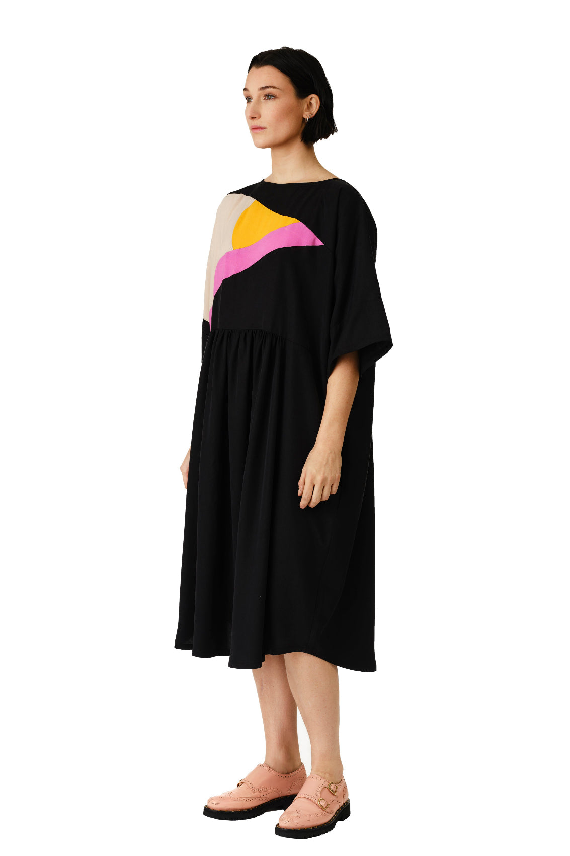 In a play on abstraction, Jennifer Glasgow creates balance with her colorblock dress of the season. The graphic bodice blends rounded shapes and sharp angles, capturing the light in motion. Crafted from soft Tencel twill, the Jades dress features dropped sleeves and functional pockets. Its mid-calf length and the fluidity of the fabric embrace every movement. Bold and comfortable, it creates a contemporary silhouette that won't go unnoticed.