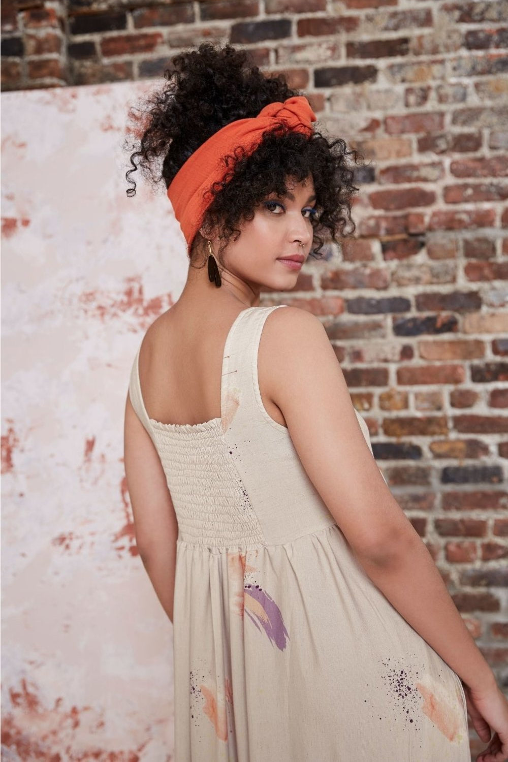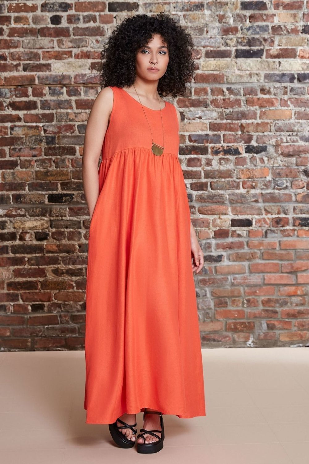 Full length sleeveless dress with empire waist and honeycomb elastic back panels.