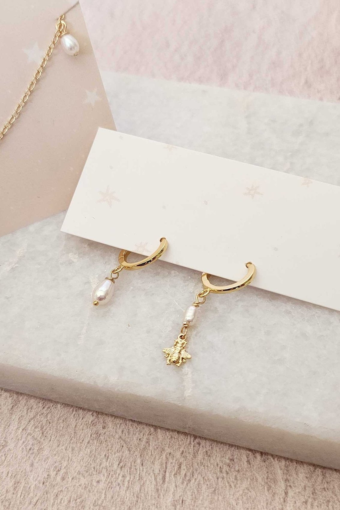 Short necklace with freshwater pearl and vintage bee charm (brass) mounted on a delicate 14K gold filled chain. With small extension at the back, for a perfect fit.