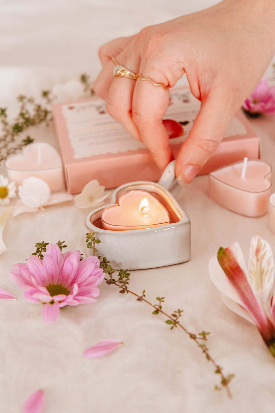 Here is the heart-shaped ceramic tealight holder the ideal companion for Blush Hearts tealight holders . Carefully crafted, this adorable heart-shaped holder is designed to hold our pink heart-shaped tealights and fill your space with warmth and charm. Whether you want to create the ambiance for a cozy evening or add a little love to your self-care routine, this tealight holder is here to brighten your moments.