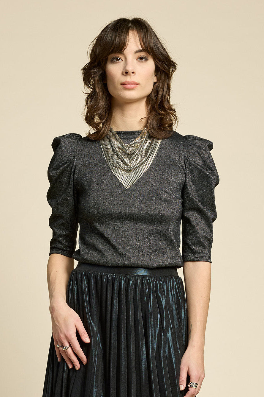 Crew-neck top crafted from a shiny fabric knitted in Montreal. We love its puffed sleeves, which add a lovely volume to the silhouette.