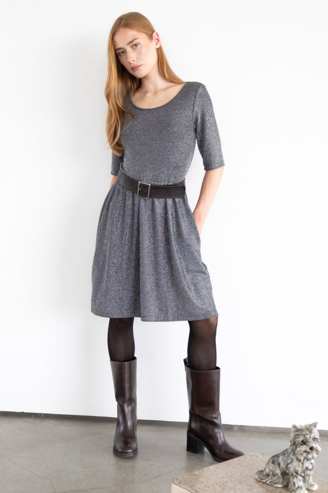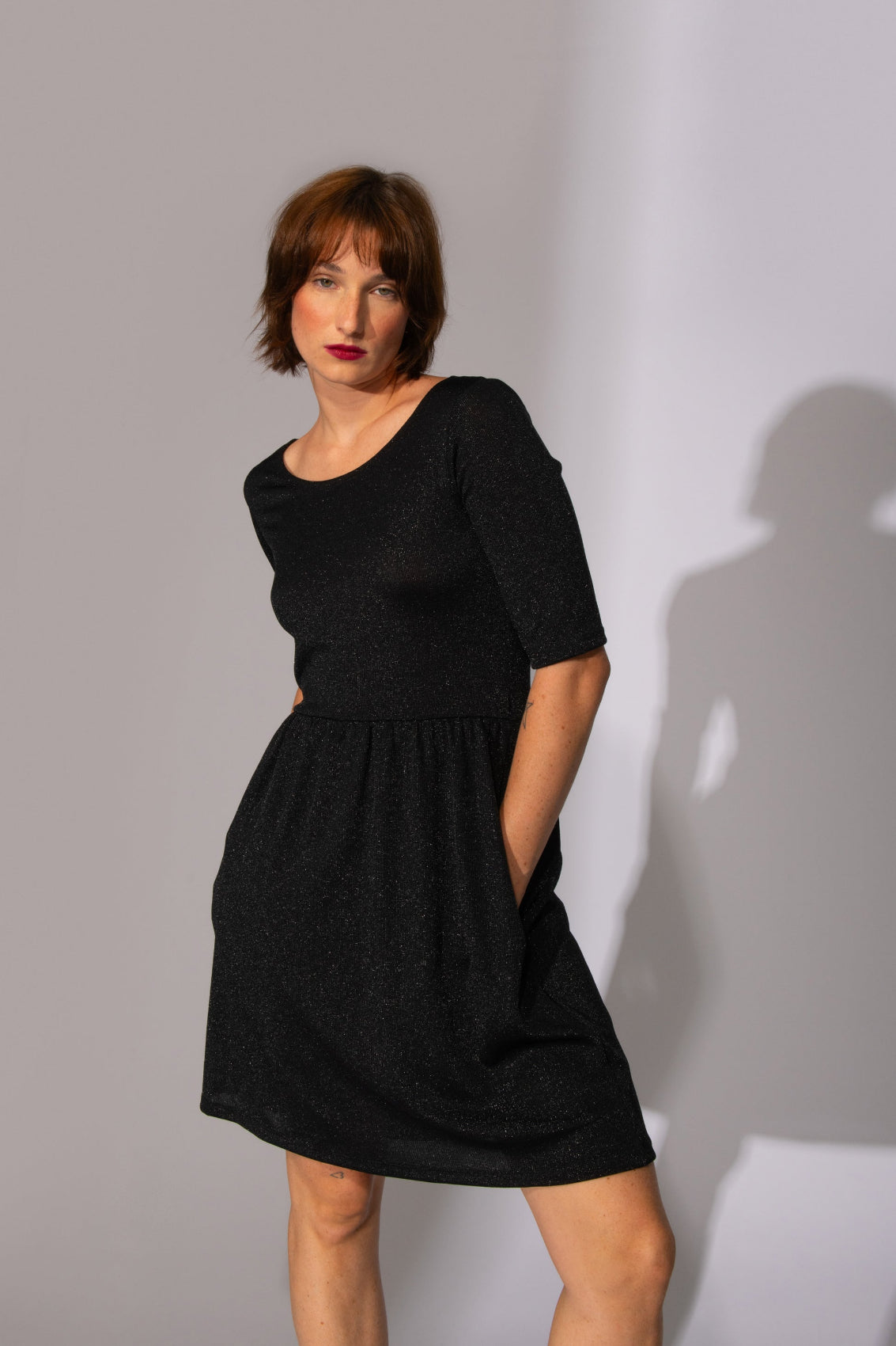 Classic and versatile dress combining comfort and style. Features a rounded front collar, a sleek V-back, and convenient side pockets. Available in a stretchy shimmer fabric for a truly evening look.