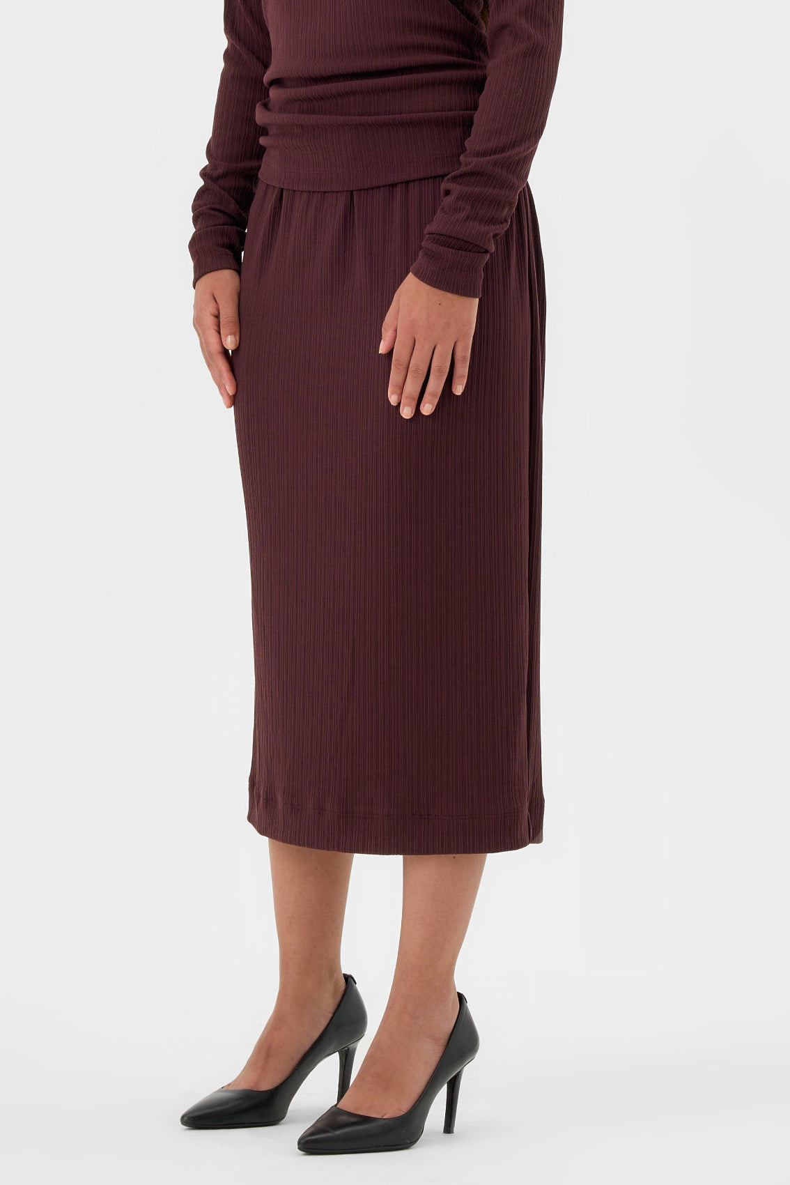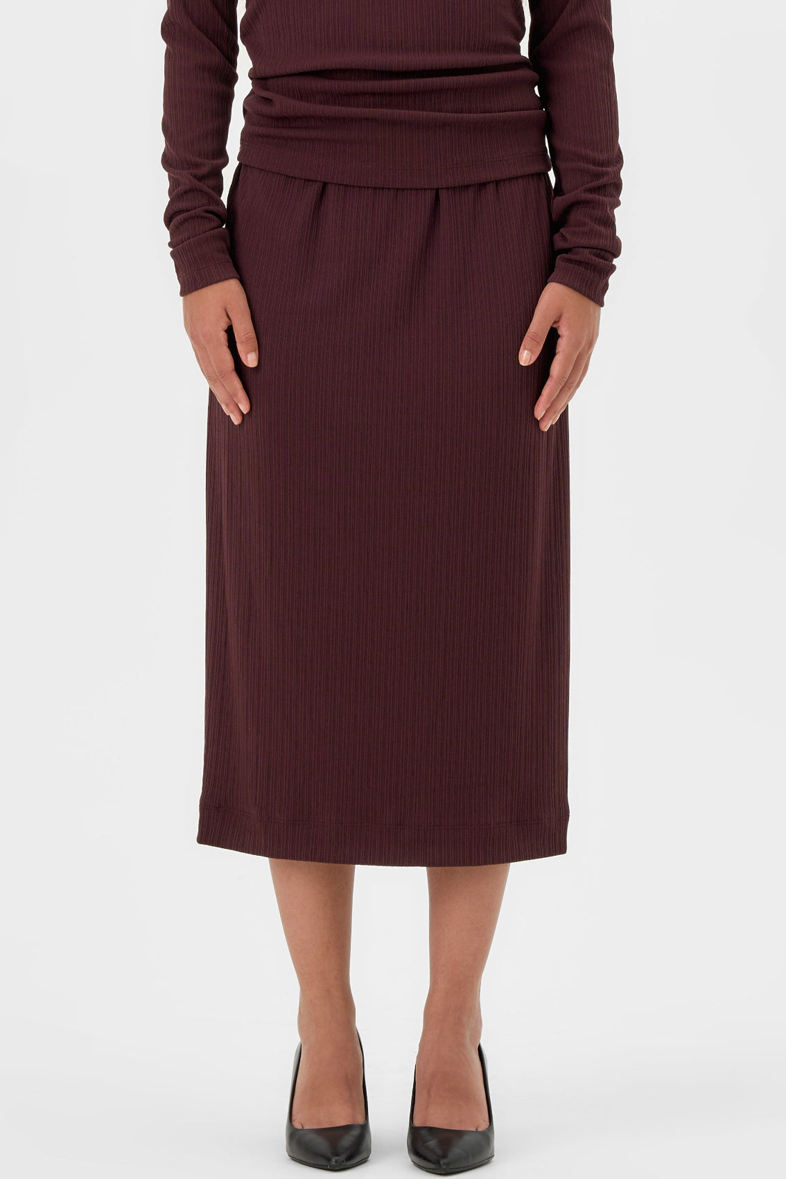 This midi skirt combines elegance and simplicity with its comfortable elastic waistband and center back slit. The ribbed fabric, which is very stretchy, stands out with its vibrant color. It perfectly complements the high-neck top for a harmonious and sophisticated look.