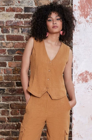 MINIMUM Gilet Freas - Beige, veste sans manches col V avec boutons. Vendu dans une boutique de créateurs locaux.