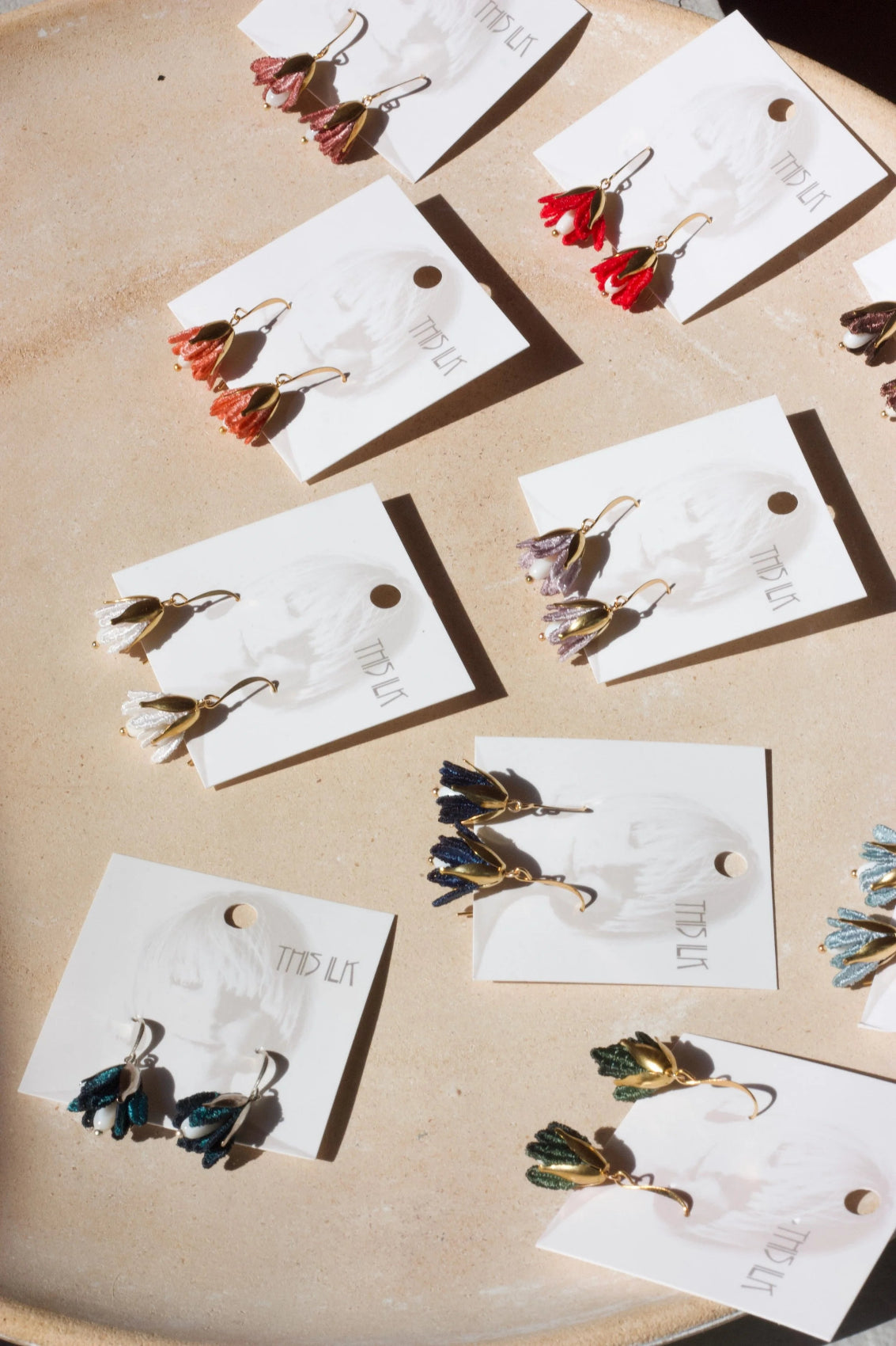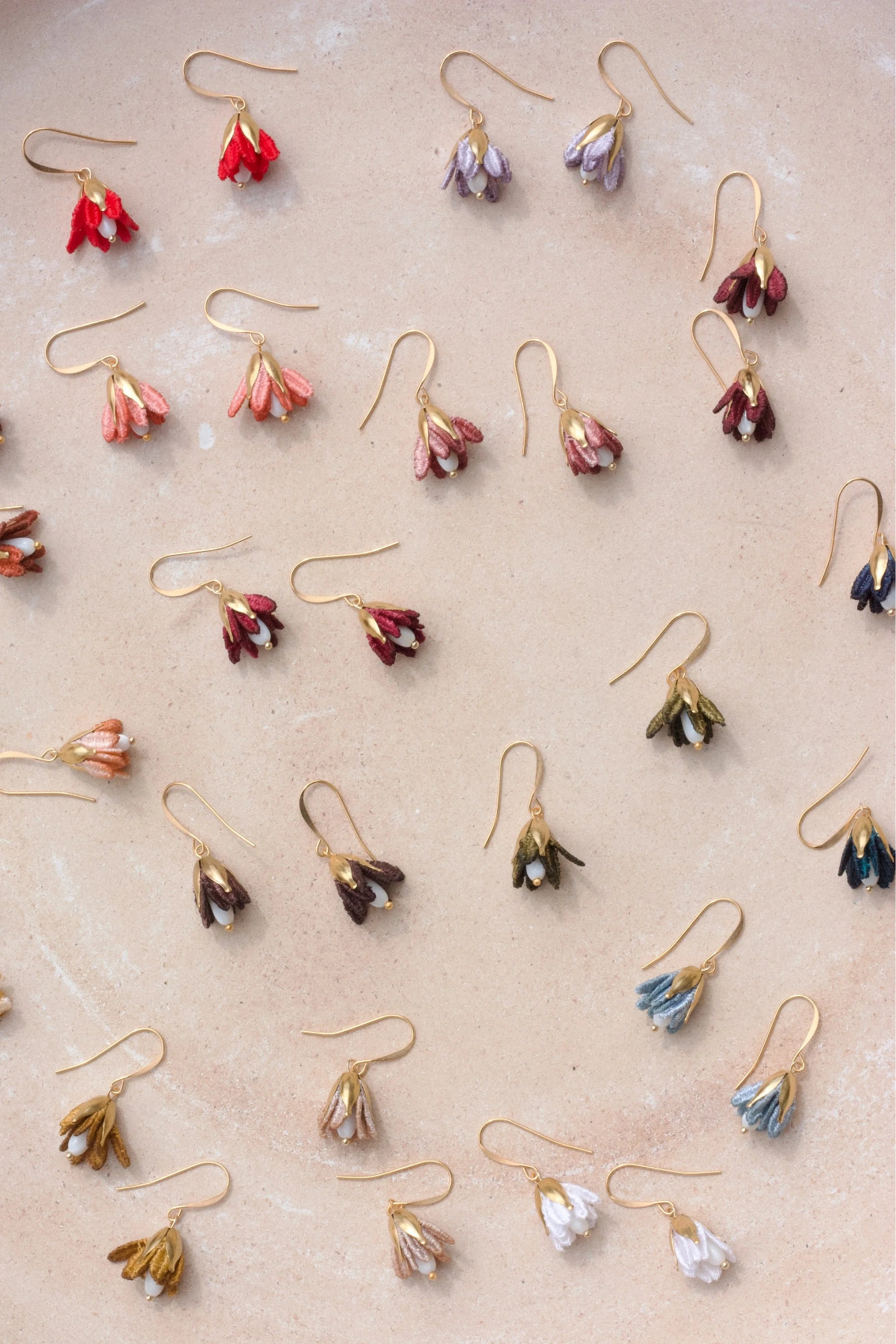 Made with vintage white lace or one of our hand-dyed colors inspired by the botanical world, subtly pearly white shell beads and raw brass components, with hypoallergenic gold-plated ear hooks, these earrings are undoubtedly the easiest to put on before going out.