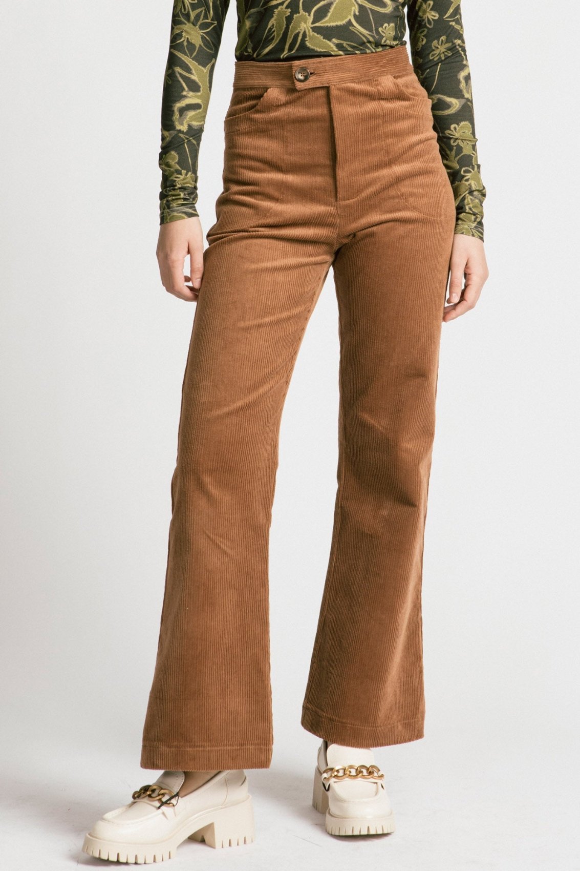 These corduroy pants have a higher rise with a fly and front pockets. The bottom is a bell bottom, a more fitted leg with a flared cut. It is made from a wider corduroy with spandex for added stretch.